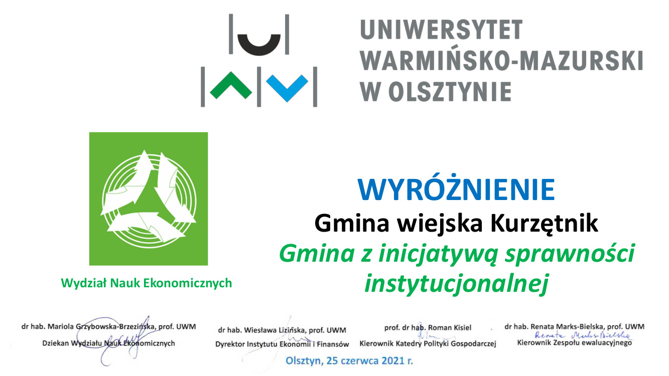 W związku z wynikami ankiety ewaluacyjnej Sprawność instytucjonalna miast i gmin, z którego skorzystała gmina, przyznano naszemu samorządowi Wyróżnienie „Gmina z inicjatywą sprawności”. Jest to wyróżnienie przyznawane gminom w Polsce, które do oceny sprawności instytucjonalnej skorzystały w naszym województwie z ww. narzędzia w latach 2017-2020, a także swoją aktywnością przyczyniają się do poprawy poziomu sprawności oraz poziomu rozwoju społeczno-gospodarczego.