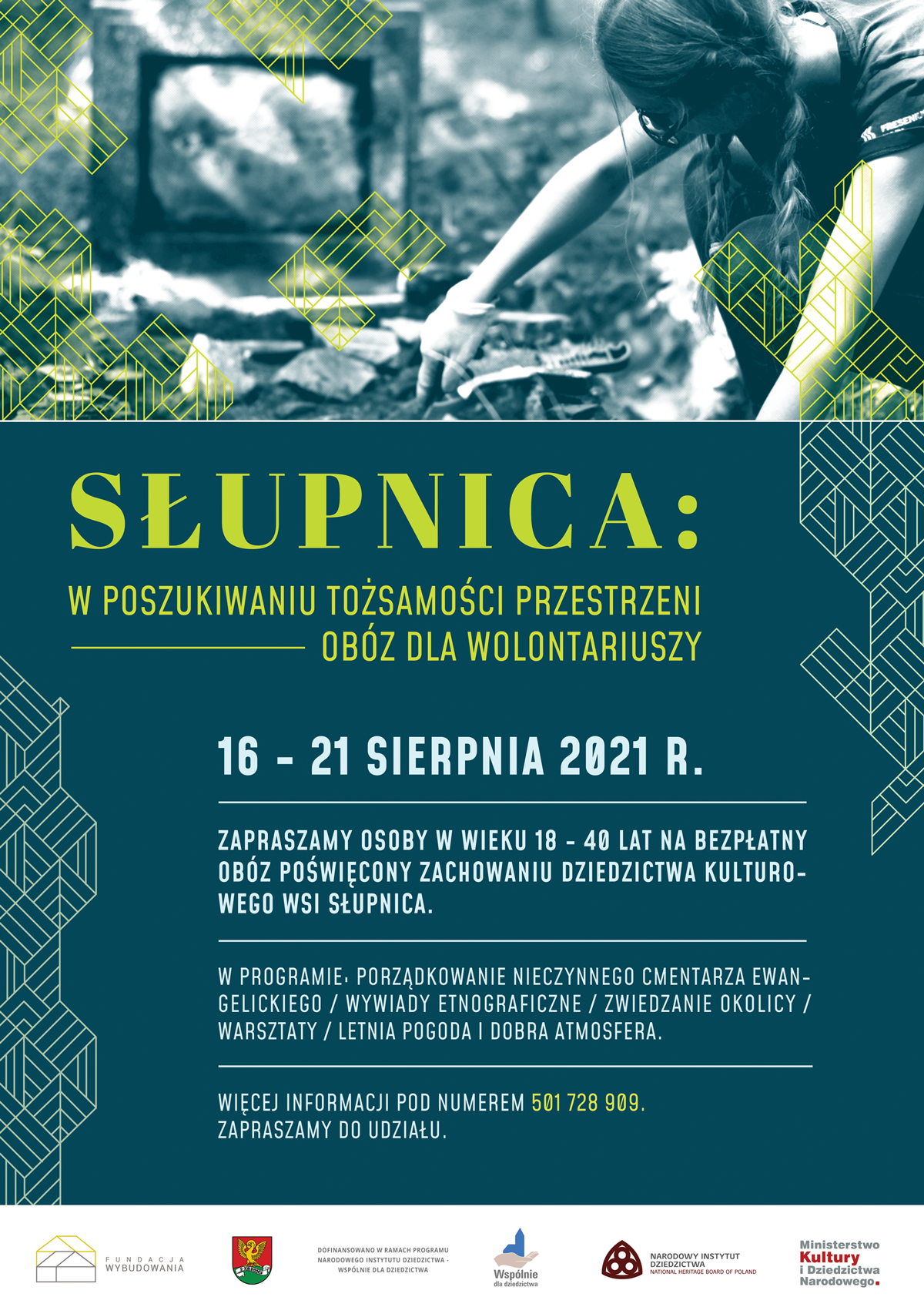 W dniach 16 - 21 sierpnia Fundacja Wybudowania zaprasza na czwartą edycję bezpłatnego obozu dla wolontariuszy. Uczestnicy w wieku od 18 do 40 lat będą brać udział w pracach porządkowych na nieczynnym cmentarzu ewangelickim we wsi Słupnica (gmina Biskupiec). Dodatkowo przeprowadzone zostaną wywiady z najstarszym pokoleniem mieszkańców wsi oraz udokumentowana zostanie zabytkowa architektura wsi. Udział w projekcie jest darmowy. Zapewniamy nocleg i wyżywienie. Zgłoszenia i więcej informacji pod numerem telefonu 501 728 909 lub adresem fundacja@wybudowania.pl.