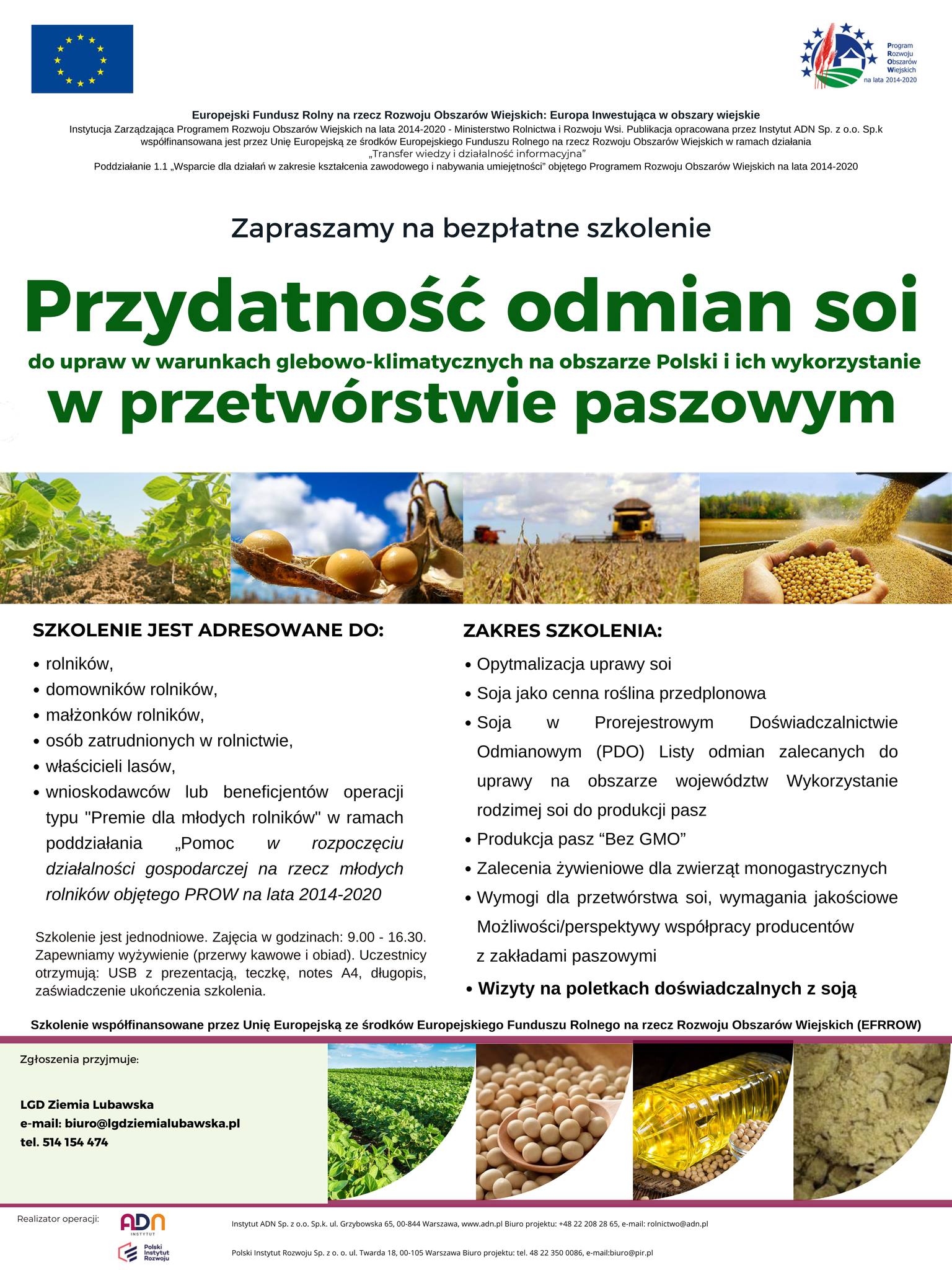 Zapraszamy na szkolenie - „Przydatność odmian soi do uprawy w warunkach glebowo-klimatycznych na obszarze Polski i ich wykorzystanie w przetwórstwie paszowym”