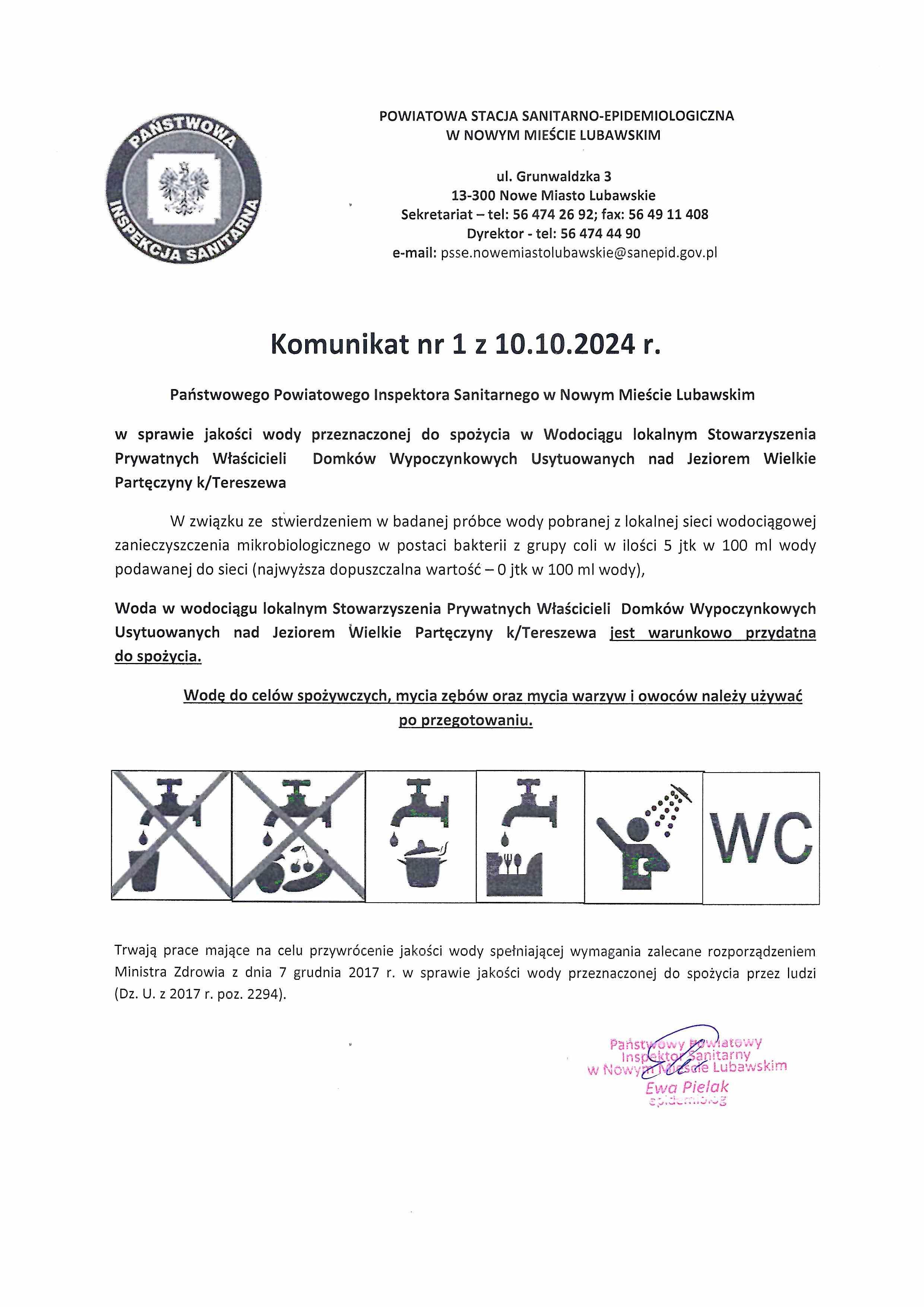 Komunikat w sprawie jakości wody przeznaczonej do spożycia nad jeziorem Wielkie Partęczyny