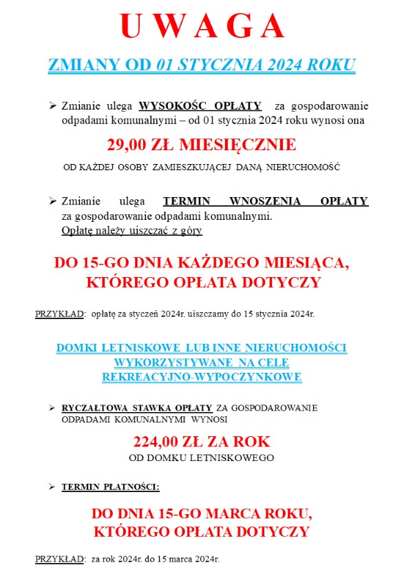 Od 1.01.2024 r. zmianie ulega wysokość opłaty za gospodarowanie odpadami komunalnymi i wynosi ona 29 zł/os. miesięcznie. Płatności należy dokonywać do dnia 15-go każdego miesiąca, którego opłata dotyczy.