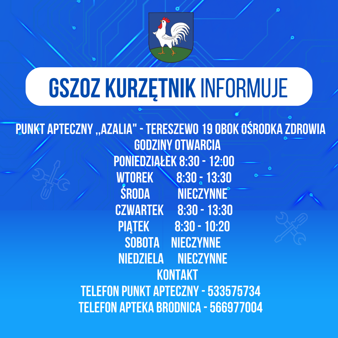 Gminny Samodzielny Zakład Opieki Zdrowotnej informuje o otwarciu punktu aptecznego w Tereszewie.
