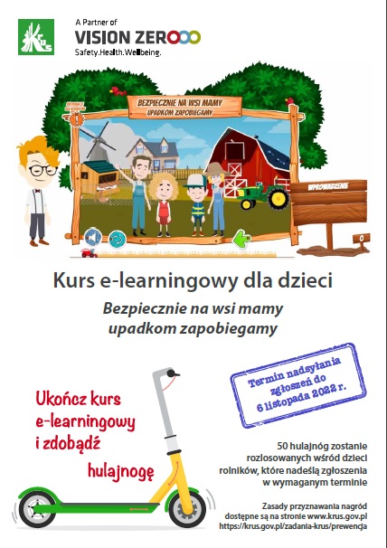 Po raz czwarty Kasa Rolniczego Ubezpieczenia Społecznego zaprasza dzieci rolników urodzone w latach 2008–2016 do udziału w kursie e-learningowym „Bezpiecznie na wsi mamy – upadkom zapobiegamy”, który w nowoczesnej formie przybliża wiedzę o zagrożeniach wypadkowych