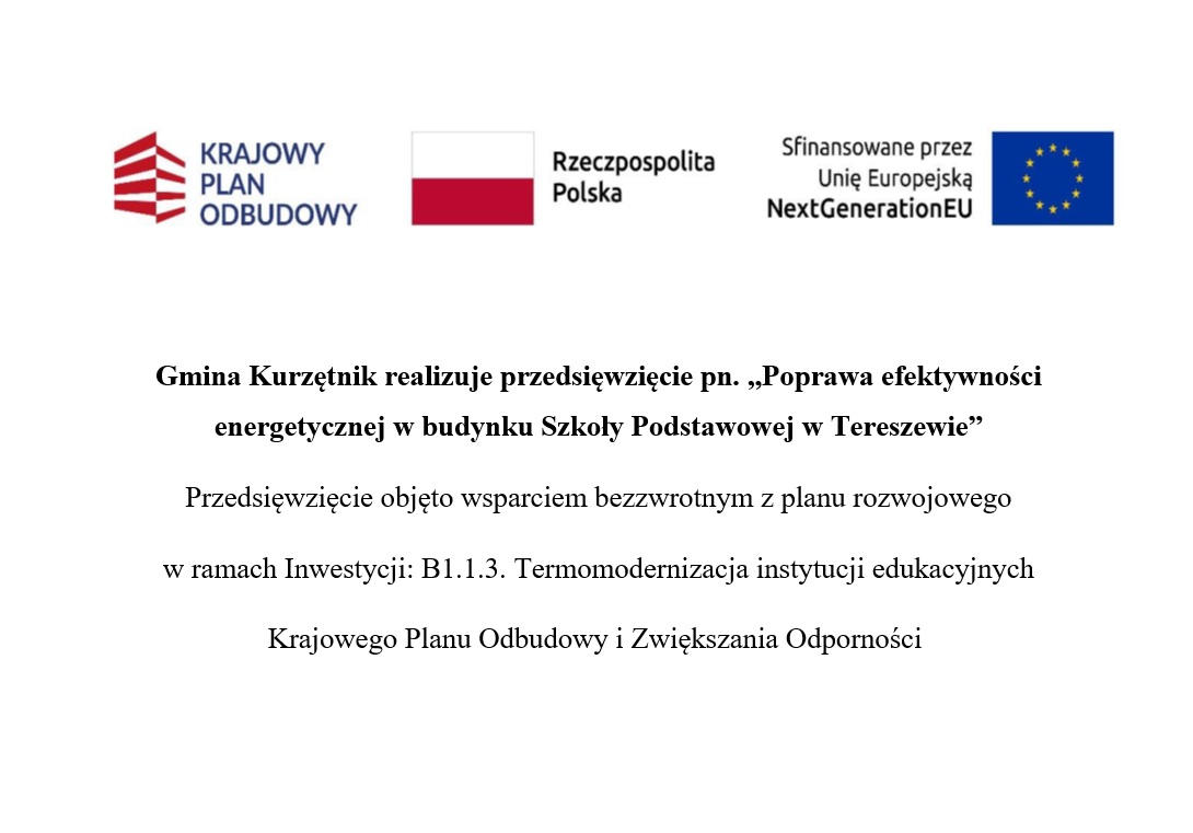 Gmina Kurzętnik w dniu 2 lutego 2026 roku zawarła z Narodowym Funduszem Ochrony Środowiska i Gospodarki Wodnej Umowę o objęcie wsparciem bezzwrotnym z planu rozwojowego – przedsięwzięcie pn. „Poprawa efektywności energetycznej w budynku Szkoły Podstawowej w Tereszewie” w ramach Inwestycji: B1.1.3. Termomodernizacja instytucji edukacyjnych Krajowego Planu Odbudowy i Zwiększania Odporności.
